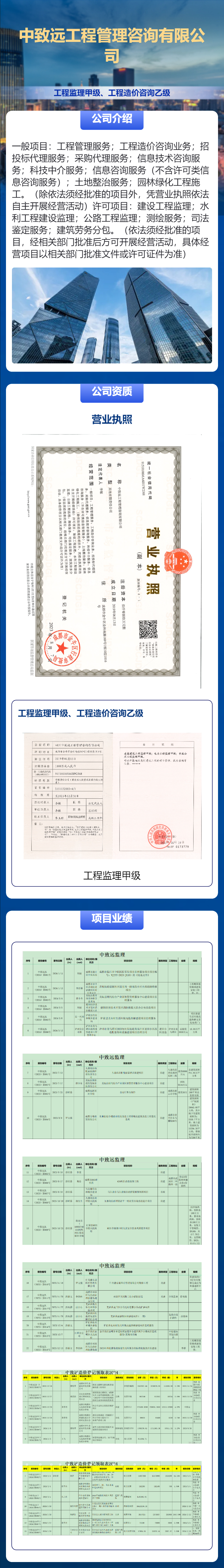 公司简介:一般项目:工程管理服务;工程造价咨询业务;招投标代理服务;采购代理服务;信息技术咨询服务;科技中介服务;信息咨询服务(不含许可类信息咨询服务);土地整治服务;园林绿化工程施工。(除依法须经批准的项目外,凭营业执照依法自主开展经营活动)许可项目:建设工程监理;水利工程建设监理;公路工程监理;测绘服务;司法鉴定服务;建筑劳务分包。(依法须经批准的项目,经相关部门批准后方可开展经营活动,具体经营项目以相关部门批准文件或许可证件为准)